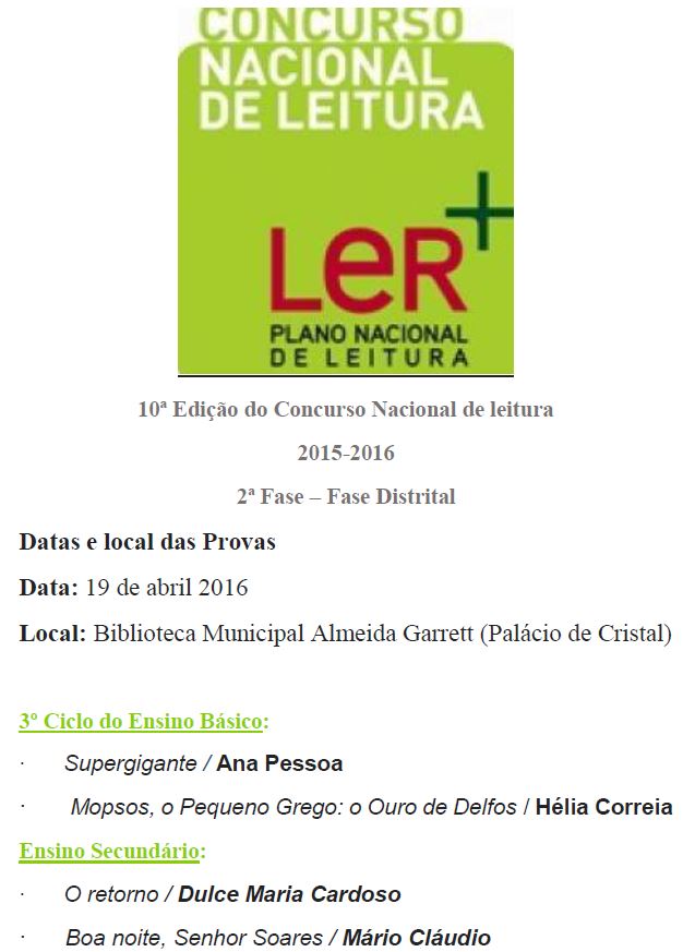 Mostrar mensagens com a etiqueta CONCURSO NACIONAL DE LEITURA - Fase distrital - Obras para leitura e data de realização da prova. Mostrar todas as mensagens